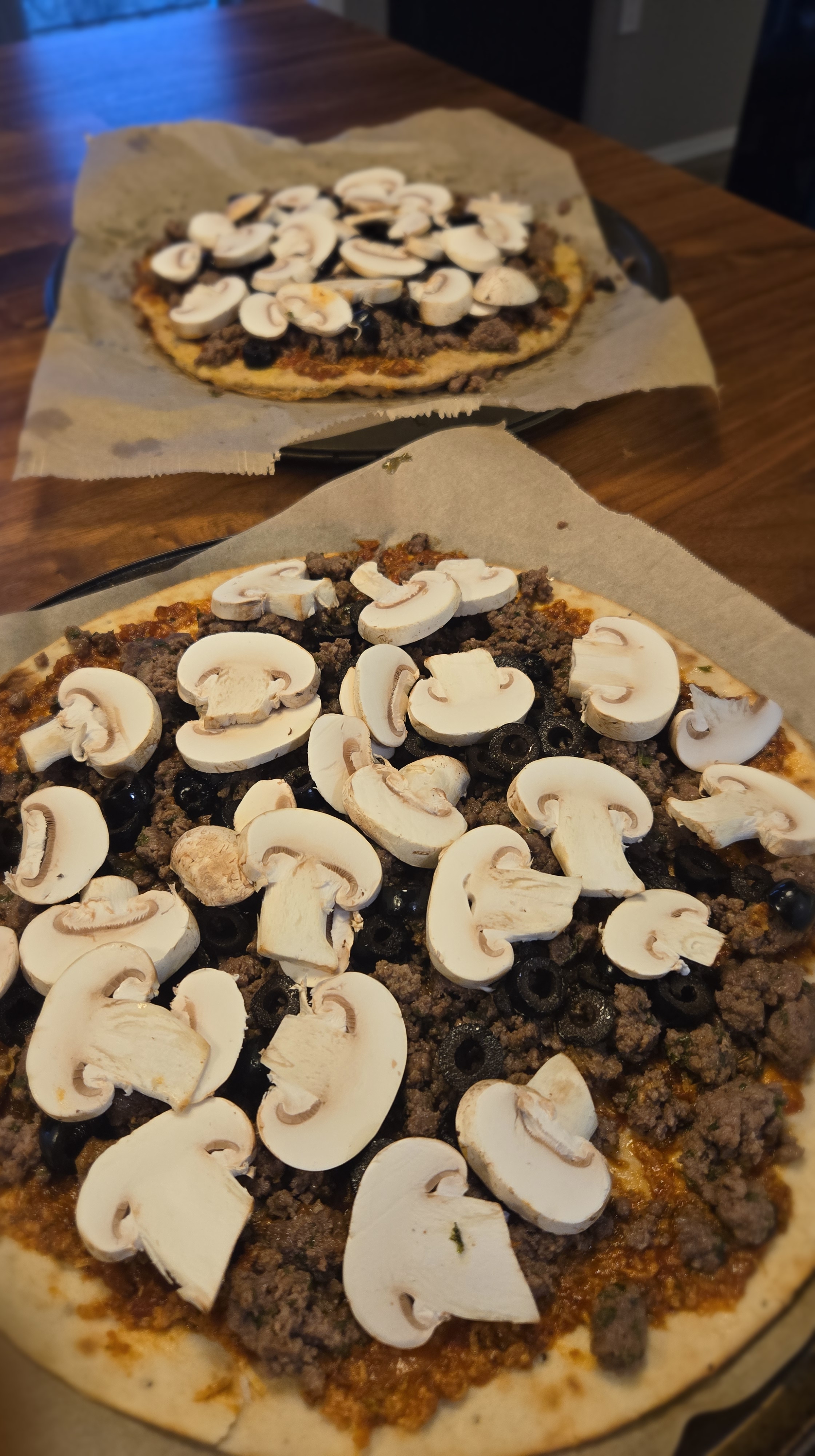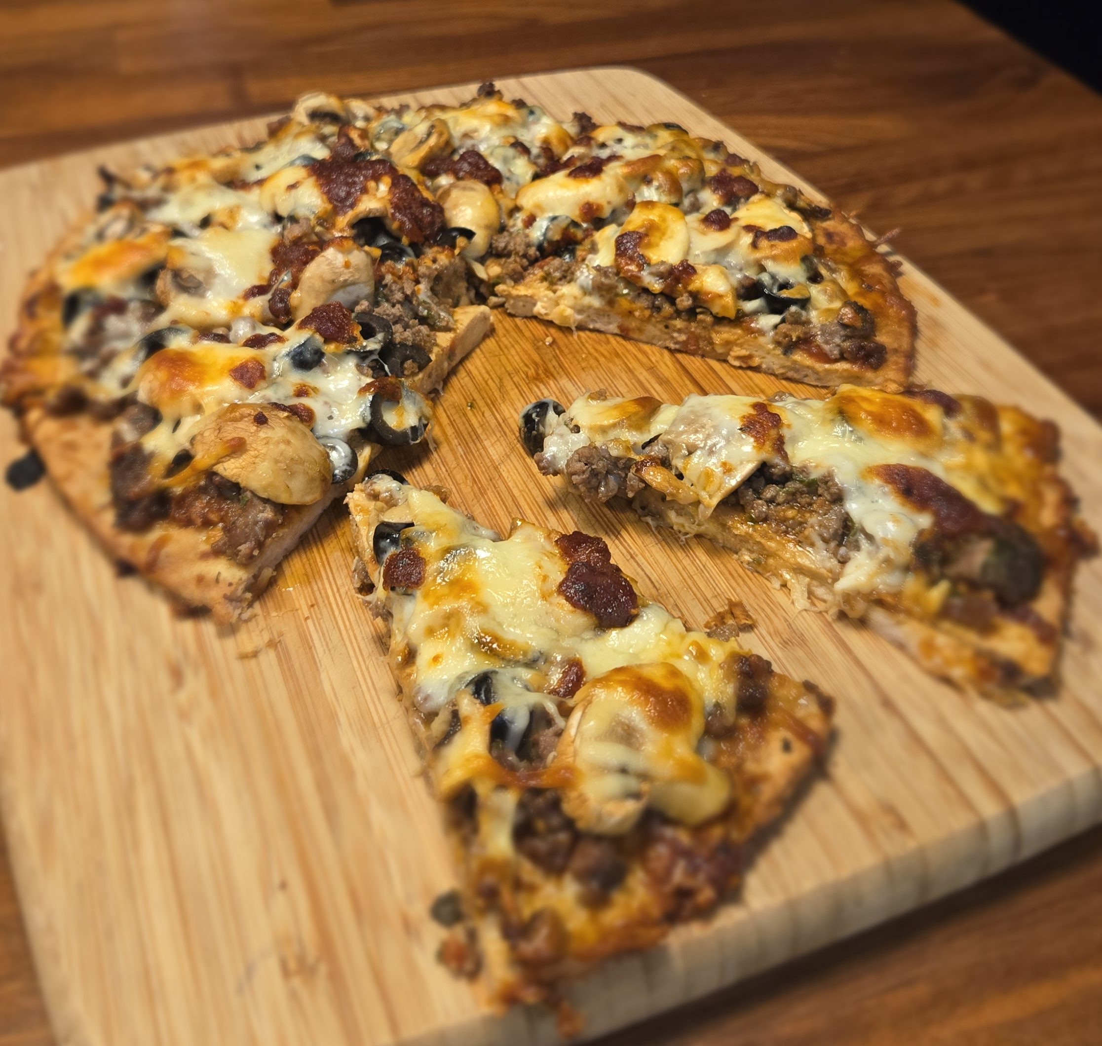 Traditional pizza starts with dough. This one starts with seasoned ground chicken — pressed, shaped, baked until golden and sturdy.
